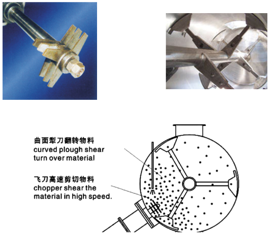 | ◆工作原理 JSLP型系列犁刀飞刀混合机有驱动机构、卧式筒体、犁刀、飞刀四部分组成;物料在犁刀作用下沿筒壁作径向周方湍动,将物料沿梨刀两侧的法线方向抛出,产生离心涡旋运动致使受力的物料三维扩散,并彼此混合,当物料流经飞刀时被高速旋转的飞刀剪切搅拌并强烈抛散,从而在较短时间内达到均匀混合。能满足固液混合以及造湿粒、干燥等复合工艺;尤其适用于粘性或胶状添剂的混合。 |